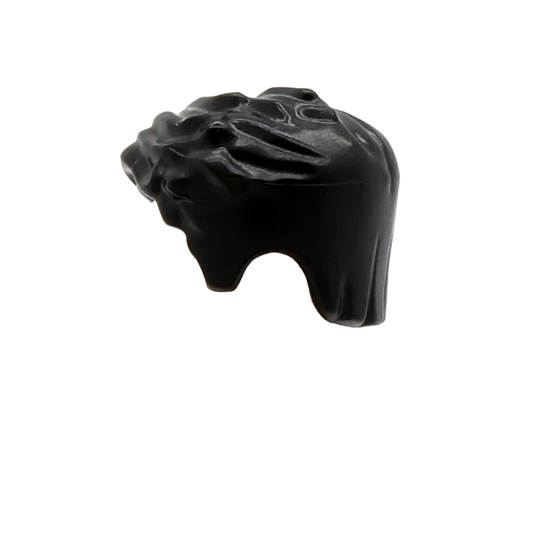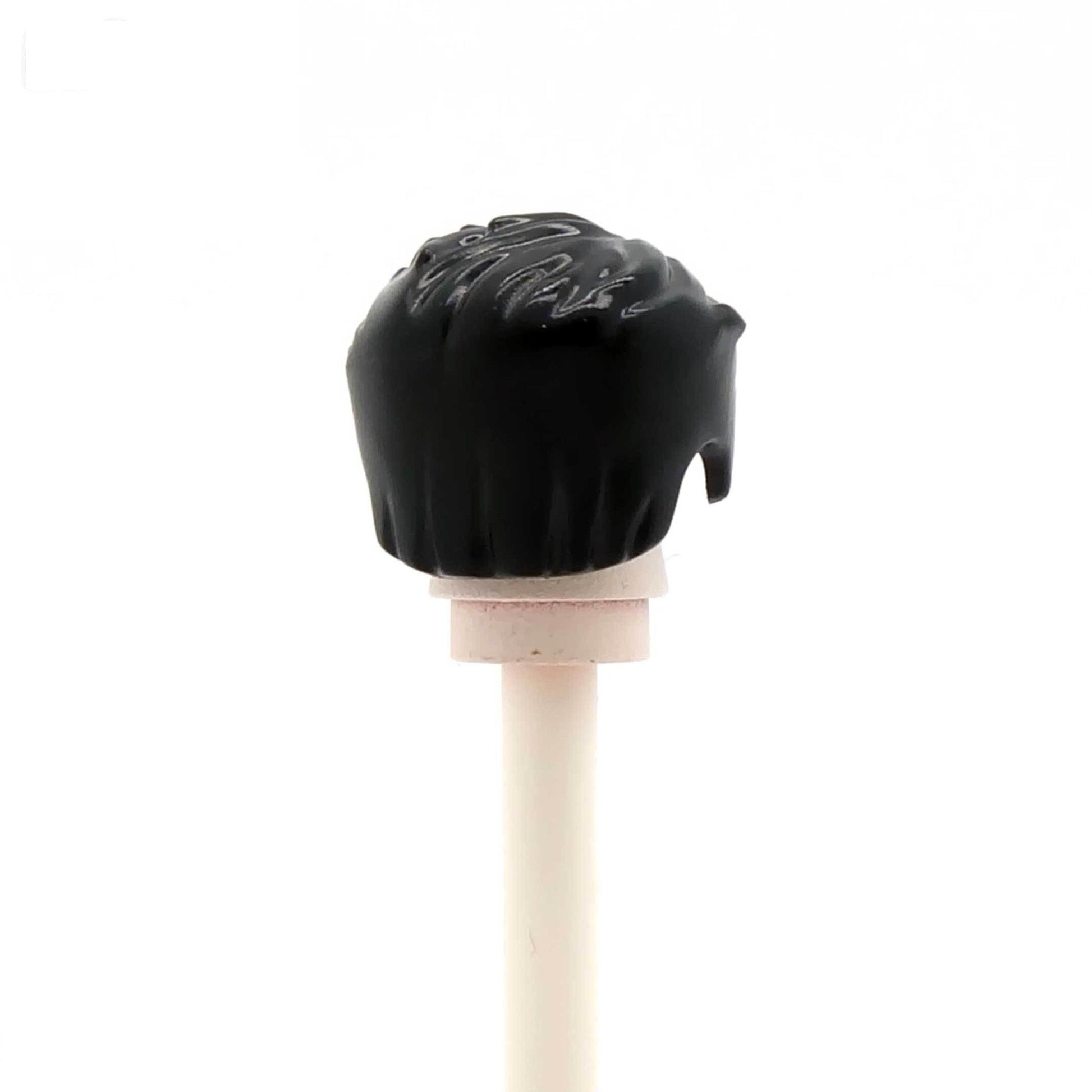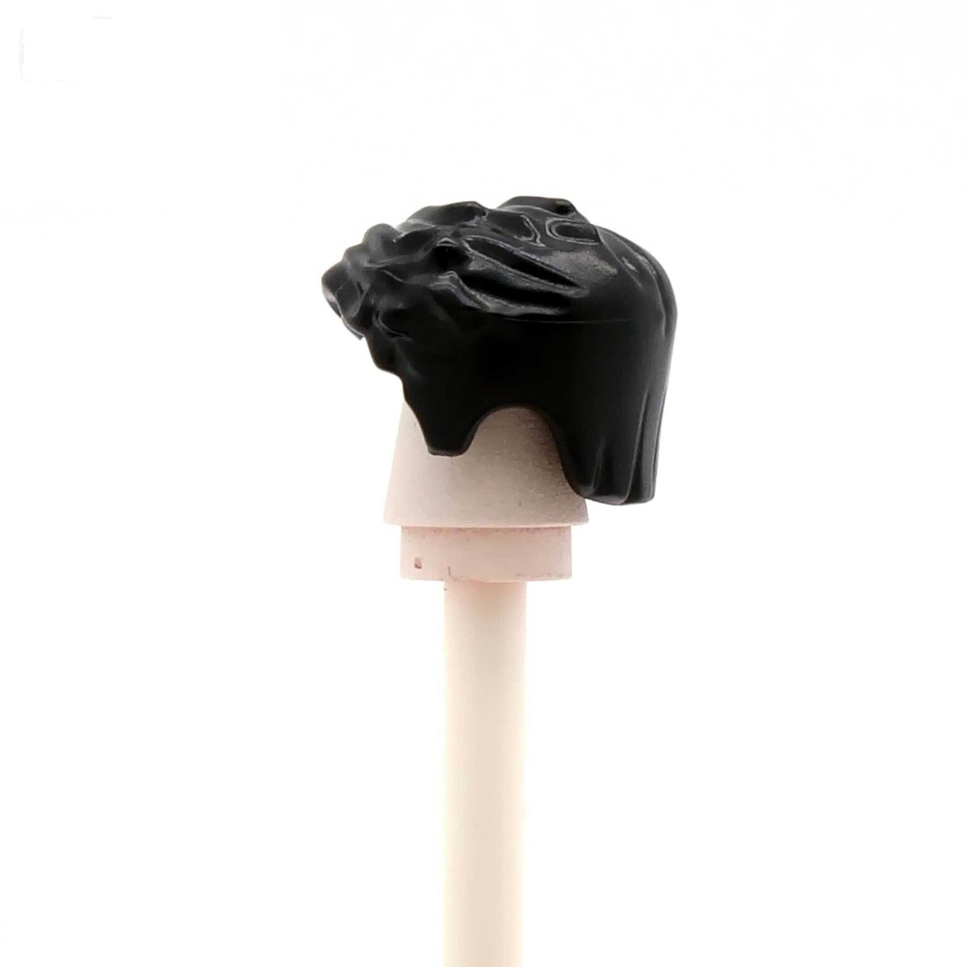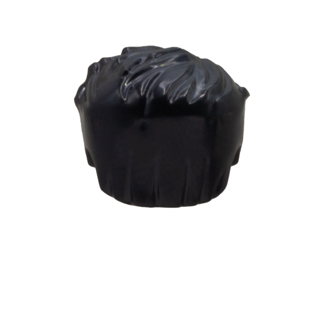 Short black hair with a pushed back fringe and a bit of a curl. This LEGO minifigure hair has a bit of a movie star vibe.