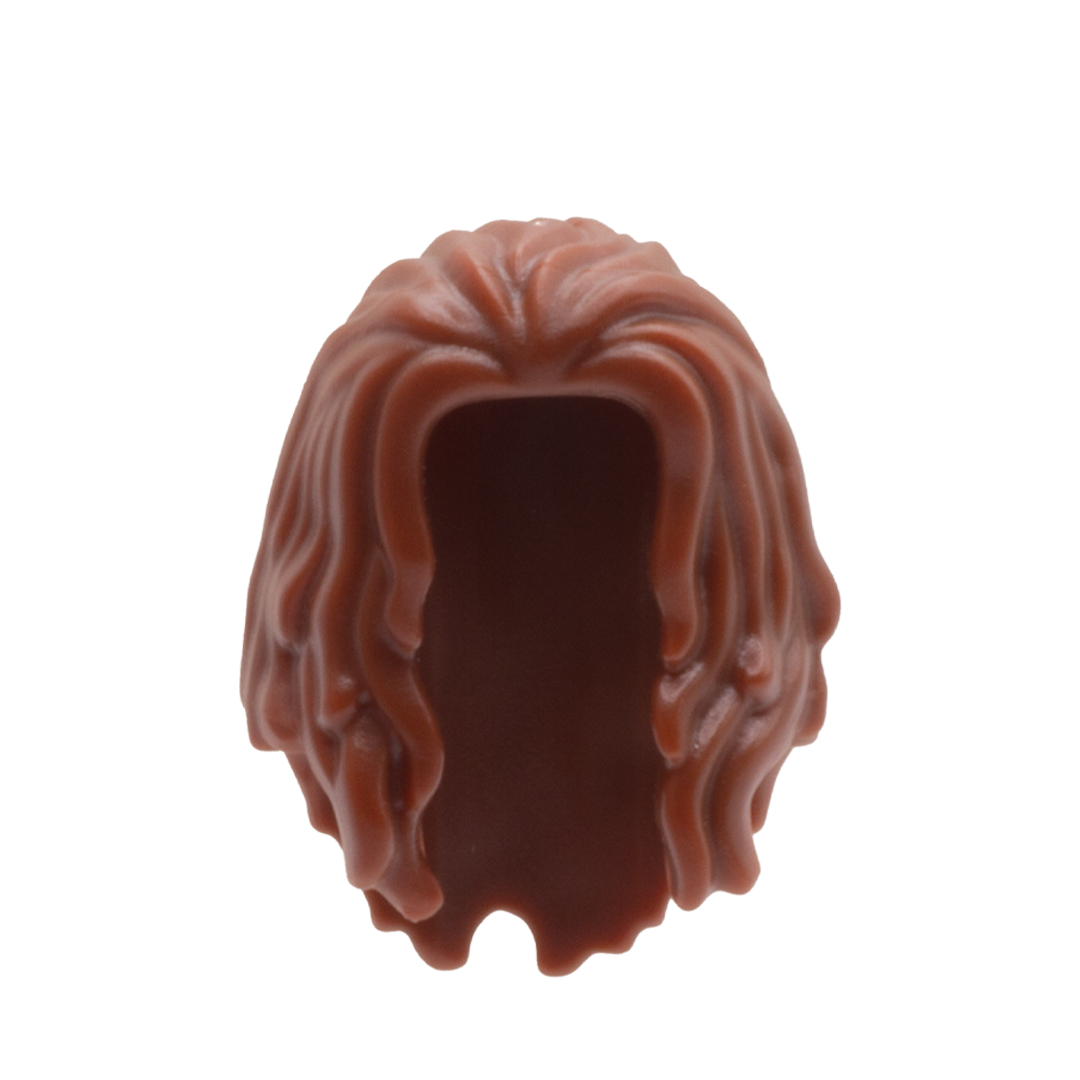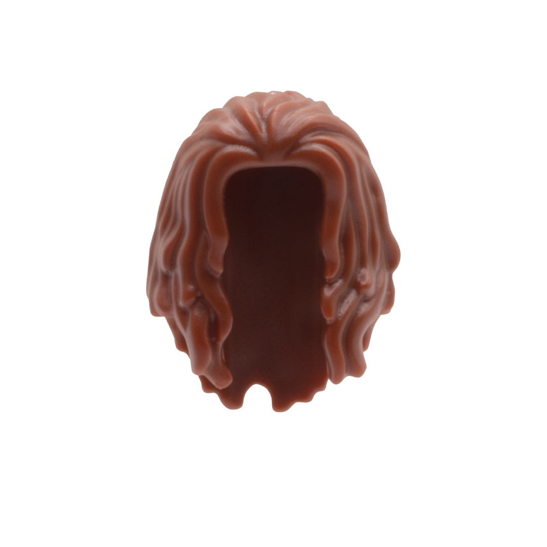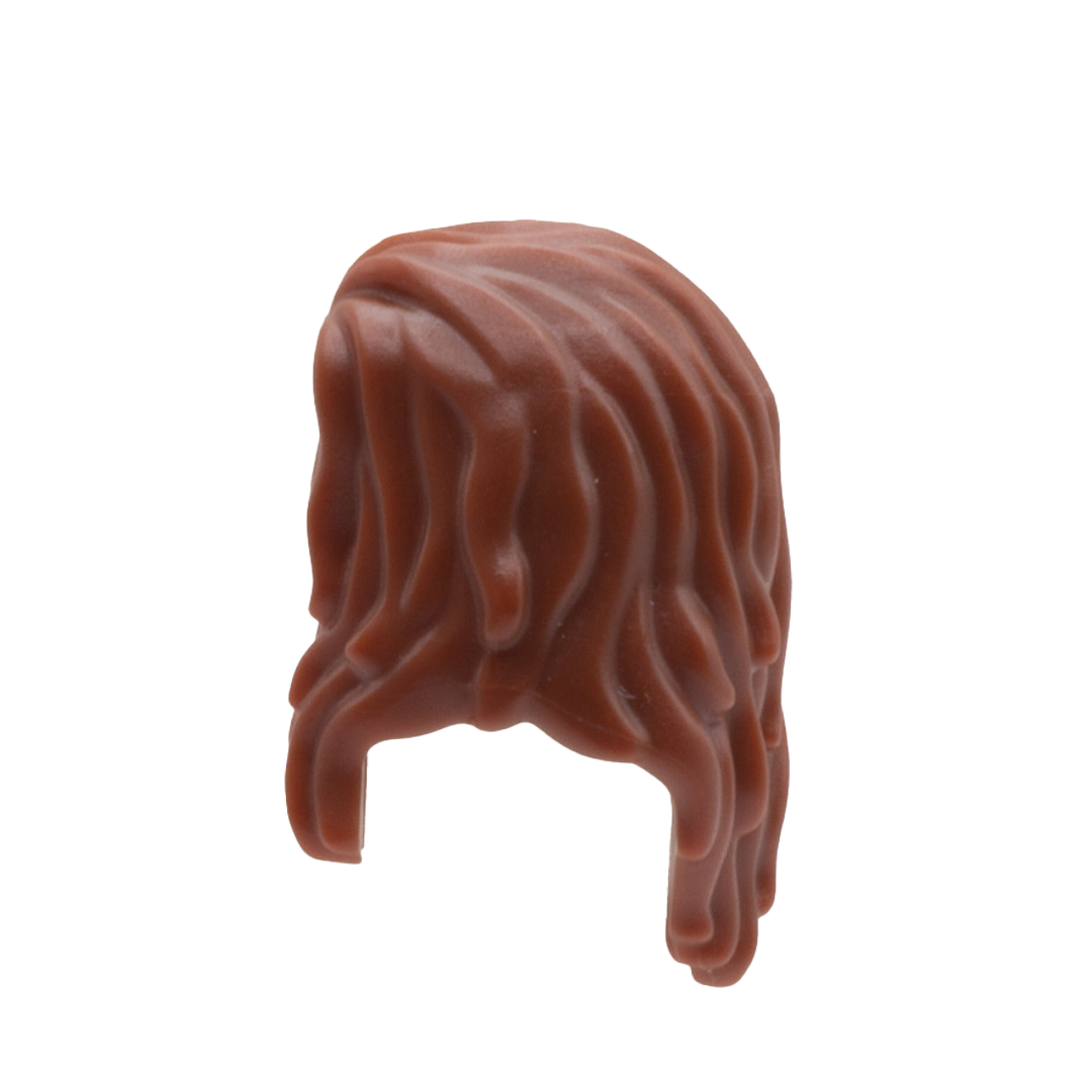 Brown hair which goes over and below the shoulders. Please note, this hair will obscure images/text on the back of minifig torsos.