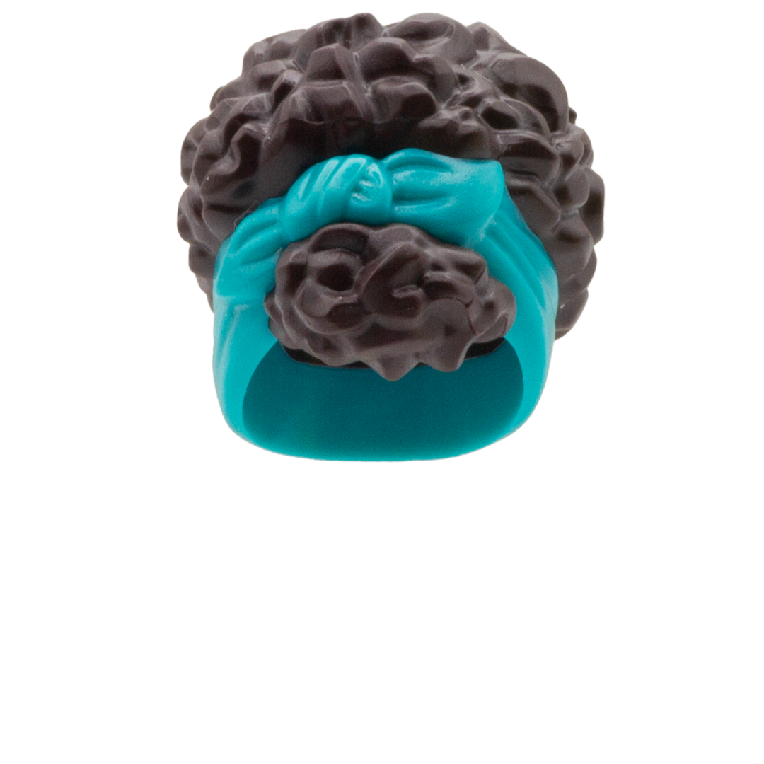 Dark brown curly up do with a teal headband. LEGO minifig hair.
