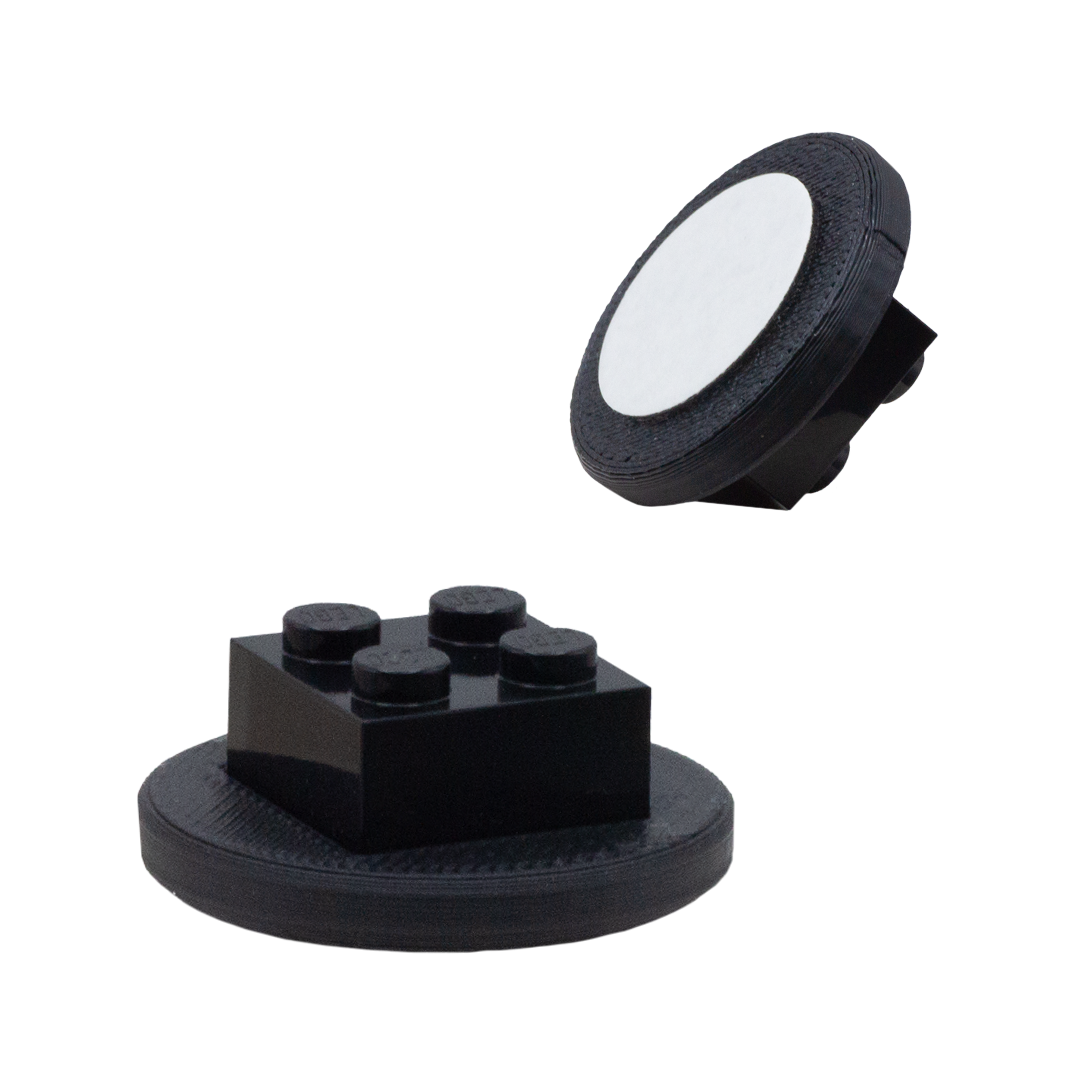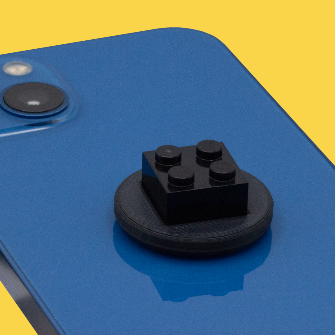 This display is a genuine black LEGO 2x2 brick attatched to a 3D-printed base. There is a peelable double-sided sticky tab for phone/phone case adhesion.