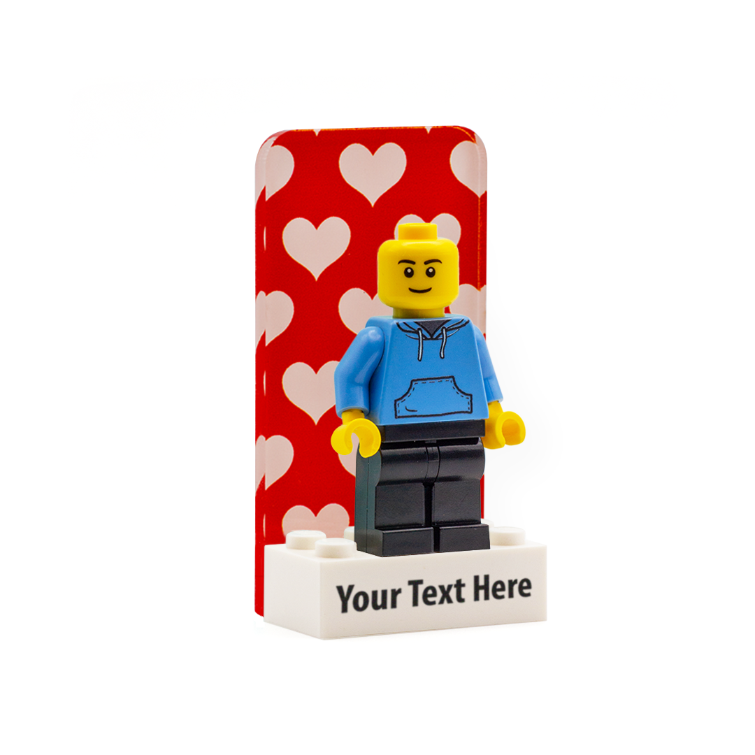 Want a cool way to display your minifig? This back panel is laser-cut acrylic, printed with our own design, and attached to a LEGO brick. If you like, you can even get a personalised message printed onto the brick!
