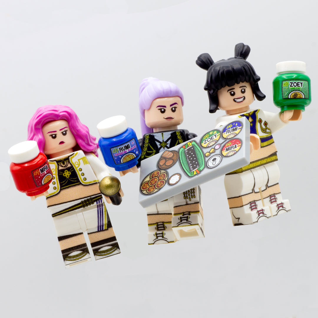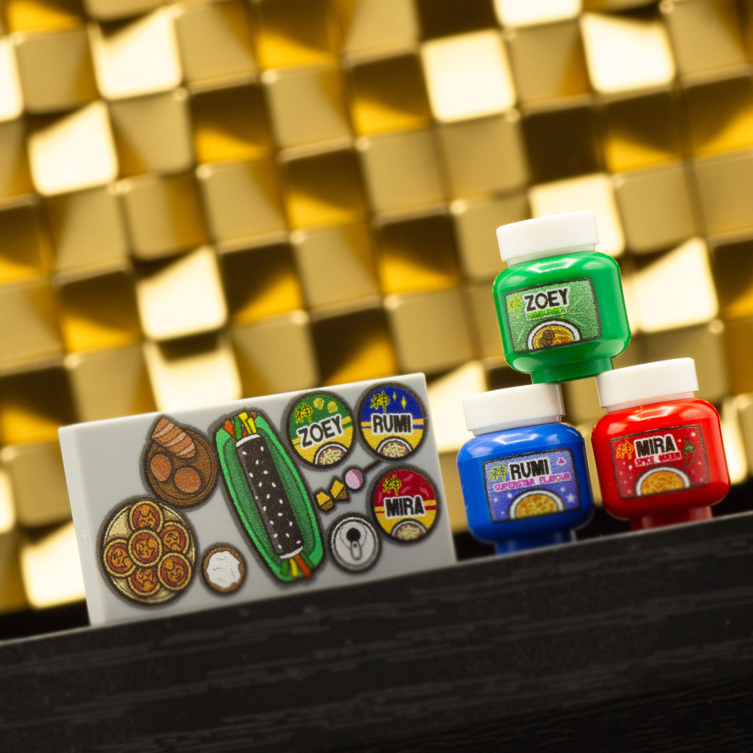 Check out this feast! 3x tubs of ramen (custom printed genuine LEGO head parts with blank white circular tile lids), and a platter of sushi, ramen, bread and other treats (custom printed onto a genuine light grey 2x4 tile).